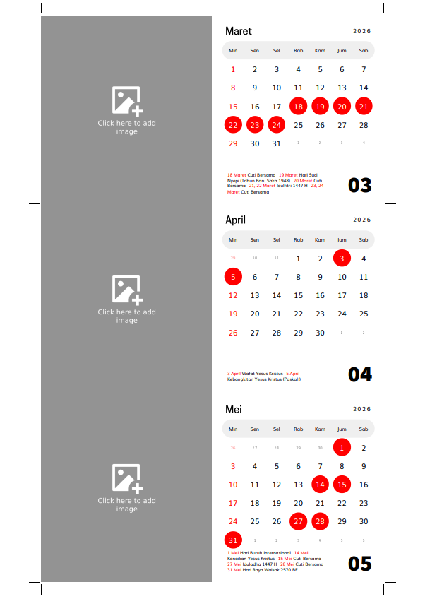 With this printable template, you can create your own desk calendar at home with a custom photo on top and a calendar area below. The calendar section supports holidays from various countries, and you can even add your own custom events. After printing the calendar, you will need to cut it. Cut lines are provided, so you just need to follow the guide for precise and consistent results.