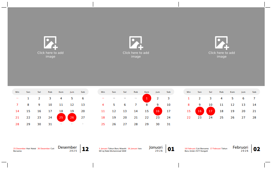 With this template, you can create a planner featuring a calendar table at the bottom and a custom image at the top.